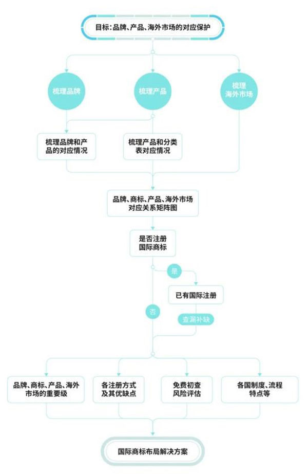 为解决国际商标布局时遇到的困难,并且避免国际商标不合理布局带来的负面影响,企业需要对自身的 国际商标保护现状进行诊断 ,采用有针对性的解决方案,实现国际商标合理布局,通过对品牌、商标、产品、海外市场的对应保护,打通走向海外的知识产权通道。