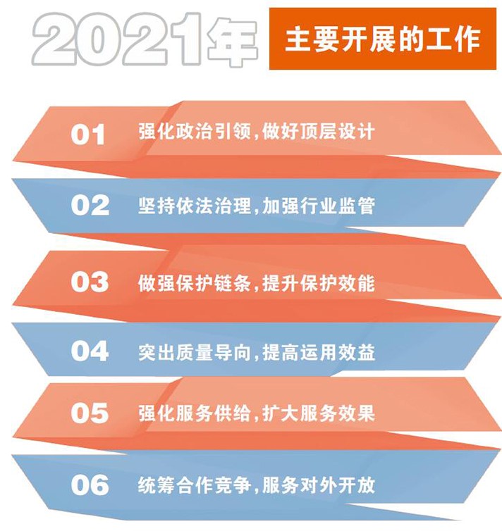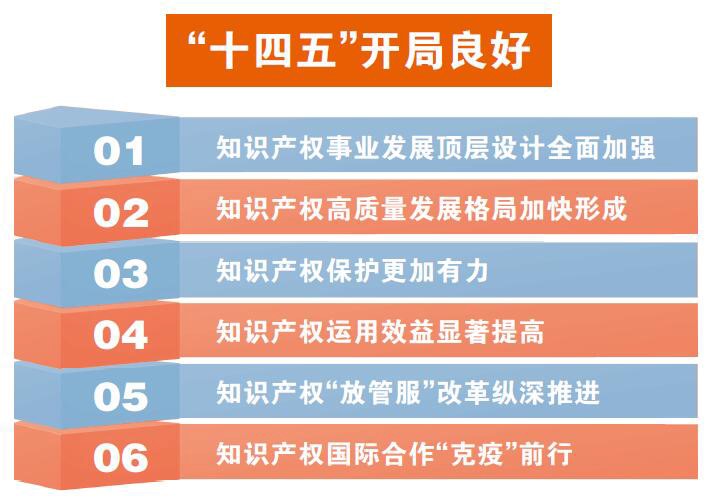 一是知识产权事业发展顶层设计全面加强。党中央、国务院印发《知识产权强国建设纲要(2021─2035年)》,这是第一份由党中央、国务院印发的知识产权重要文件;国务院印发《“十四五”国家知识产权保护和运用规划》,这是继“十三五”之后知识产权规划再次纳入国家重点专项规划。《纲要》和《规划》共同绘就了未来十五年我国知识产权事业发展的宏伟蓝图。二是知识产权高质量发展格局加快形成。推动“每万人口高价值发明专利拥有量”写入国家“十四五”规划纲要主要预期性指标,全面取消知识产权申请环节资助奖励,以空前力度打击非正常专利申请和商标恶意注册行为,行业秩序显著好转。我国在世界知识产权组织发布的2021年《全球创新指数报告》中的排名提升至第12位,再创新高。三是知识产权保护更加有力。新修改的专利法顺利实施,知识产权保护工作再次纳入中央督查检查考核计划。北京、天津、上海、浙江、山东、湖北等地高规格召开知识产权保护大会,黑龙江、安徽、河南等多地将知识产权保护工作纳入党委、政府考核体系。四是知识产权运用效益显著提高。实施专利转化专项计划和知识产权质押融资入园惠企行动。五是知识产权“放管服”改革纵深推进。国务院常务会议审议通过深化知识产权领域“放管服”改革文件,部署6个方面16项改革举措。配合开展中国营商环境知识产权指标评价。启动实施知识产权公共服务能力提升工程。商标电子证书全面推行。六是知识产权国际合作“克疫”前行。主办中美欧日韩外观设计和商标五局年度会议,人民币成为PCT相关国际费用定价和结算货币,中欧地理标志保护与合作协定有序落实,做好《区域全面经济伙伴关系协定》(RCEP)生效实施准备,有力服务了国家开放大局。