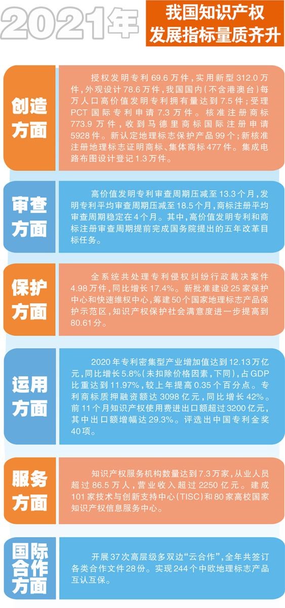 2021年,知识产权发展指标量质齐升。创造方面,授权发明专利69.6万件,实用新型312.0万件,外观设计78.6万件,我国国内(不含港澳台)每万人口高价值发明专利拥有量达到7.5件;受理PCT国际专利申请7.3万件。核准注册商标773.9万件,收到马德里商标国际注册申请5928件。新认定地理标志保护产品99个;新核准注册地理标志证明商标、集体商标477件。集成电路布图设计登记1.3万件。审查方面,高价值发明专利审查周期压减至13.3个月,发明专利平均审查周期压减至18.5个月,商标注册平均审查周期稳定在4个月。其中,高价值发明专利和商标注册审查周期提前完成国务院提出的五年改革目标任务。保护方面,全系统共处理专利侵权纠纷行政裁决案件4.98万件,同比增长17.4%。新批准建设25家保护中心和快速维权中心,筹建50个国家地理标志产品保护示范区,知识产权保护社会满意度进一步提高到80.61分。运用方面,2020年专利密集型产业增加值达到12.13万亿元,同比增长5.8%(未扣除价格因素,下同),占GDP比重达到11.97%,较上年提高0.35个百分点。专利商标质押融资额达3098亿元,同比增长42%。前11个月知识产权使用费进出口额超过3200亿元,其中出口额增幅达29.3%。评选出中国专利金奖40项。服务方面,知识产权服务机构数量达到7.3万家,从业人员超过86.5万人,营业收入超过2250亿元。建成101家技术与创新支持中心(TISC)和80家高校国家知识产权信息服务中心。国际合作方面,开展37次高层级多双边“云合作”,全年共签订各类合作文件28份。实现244个中欧地理标志产品互认互保。