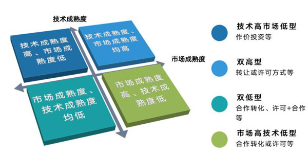 对于技术成熟度不高、市场成熟度高的成果,可考虑合作转化或许可等方式。