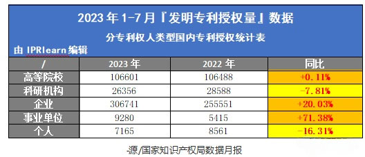 根据国知局公布的月报(分专利权人类型国内专利授权统计表)2023年1月-7月发明专利授权量与去年同比: