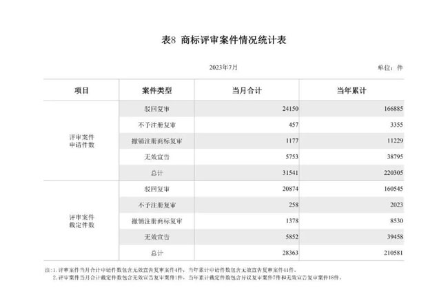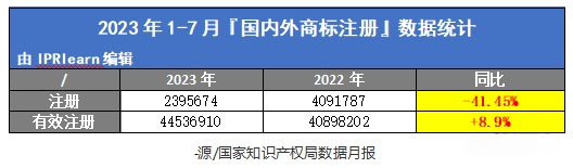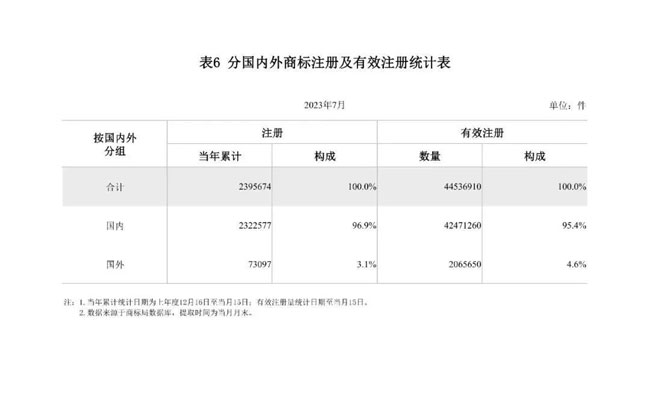 2023年1月-7月共注册商标2395674件,同比下降41.45%。截至目前,我国有效注册商标量达4089.8万件,同比增长8.9%。
