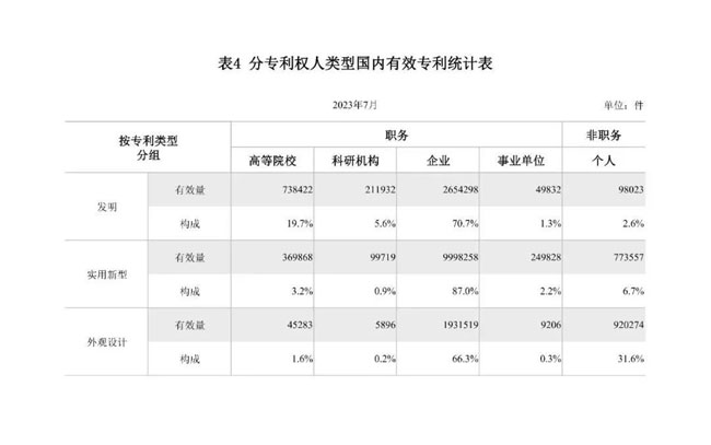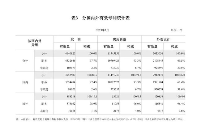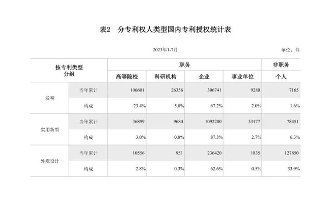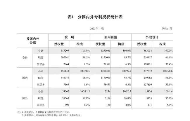 近日,国家知识产权局公布2023年1-7月知识产权数据月报: