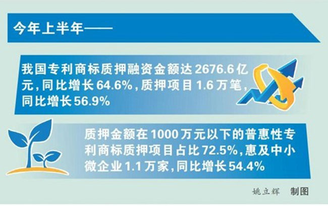 今年上半年,我国专利商标质押融资金额达2676.6亿元,同比增长64.6%,提前实现“十四五”规划目标;质押项目1.6万笔,同比增长56.9%,其中,质押金额在1000万元以下的普惠性专利商标质押项目占比72.5%,惠及中小微企业1.1万家,同比增长54.4%……2023年上半年知识产权工作新闻发布会展示的这组数据显示,我国知识产权质押融资普惠范围进一步扩大,助企纾困,为企赋能作用充分发挥。
