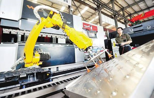 日前,在位于沧州激光产业园的河北沃克曼数控机械有限公司的板材组合加工激光智能柔性生产线上,工人在进行生产操作。